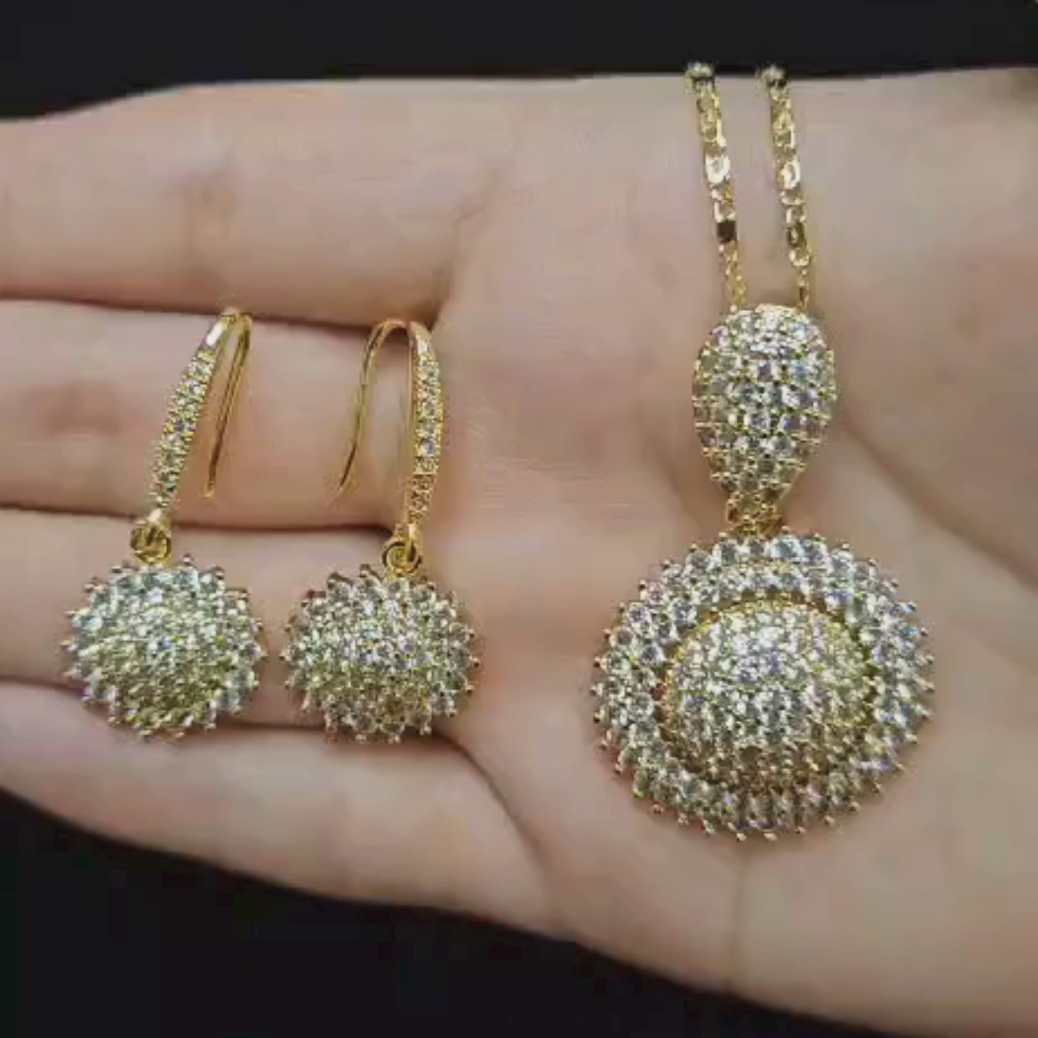 Classic and versatile, this pendant and earring set shines with round stones framed in gold and silver tones. The perfect pair to elevate both everyday and dressy looks.