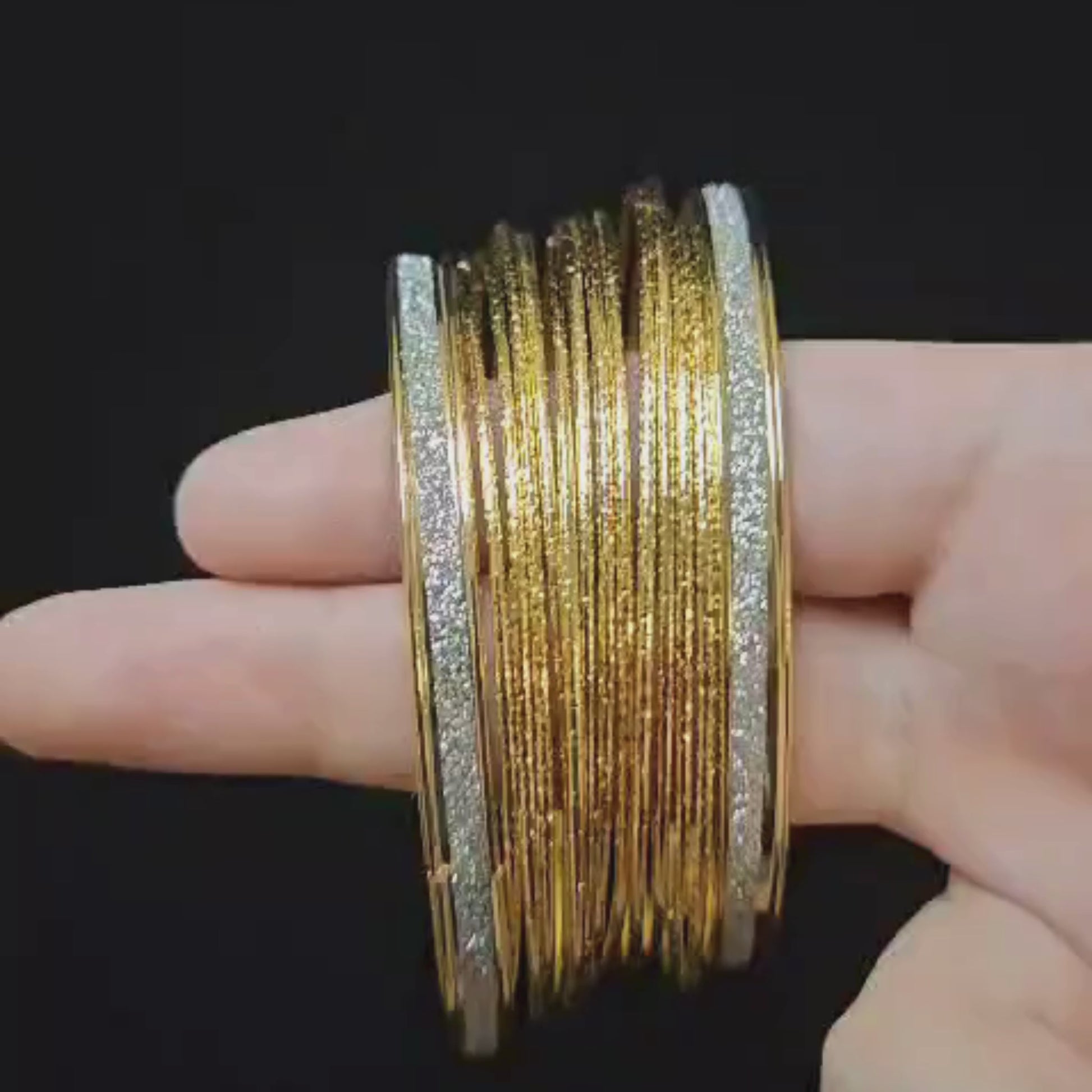 A stunning mix of shimmer and texture. This gold bangle set features silver glitter accents on the outer bangles and textured gold designs in the middle. Perfect for adding sparkle to any look.