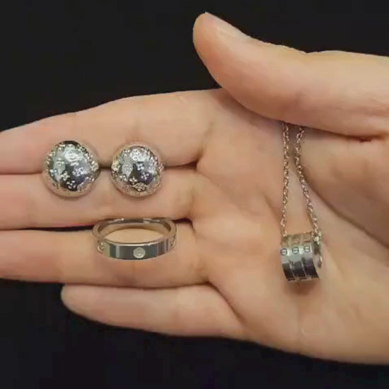 A chic four-piece set including silver-toned earrings, a ring, and a necklace. Versatile pieces you can style together or wear separately.