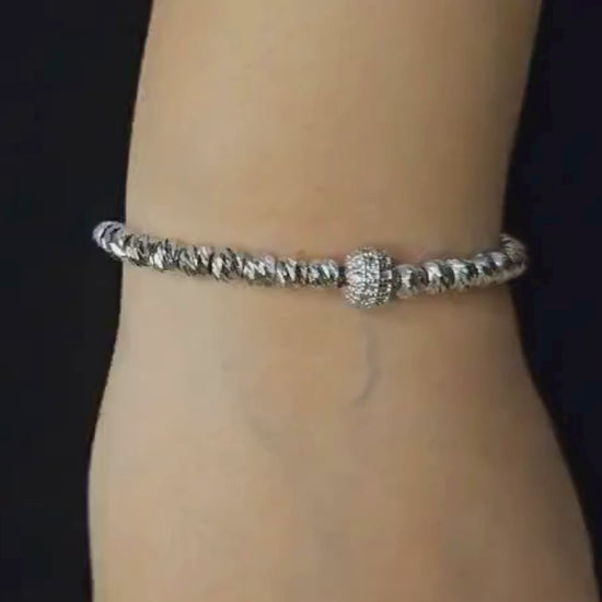 This adjustable silver bracelet features delicate textured beads and a subtle center sparkle for effortless grace.